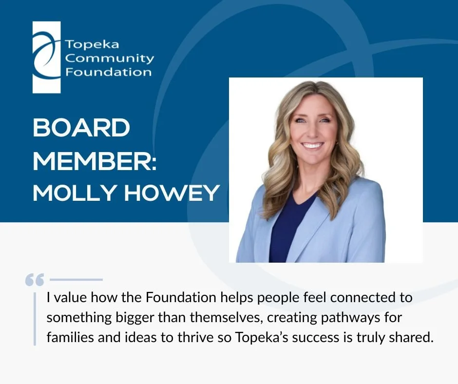 Molly Howey, CEcD, IOM, is one of the newest members to the Topeka Community Foundation Board of Directors. In July of 2025, she was selected as CEO of the Greater Topeka Partnership after 15 years at GO Topeka. She is an experienced leader in economic development and an asset to the Foundation’s work of building a Topeka where everyone can thrive.